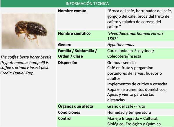 Experiencias exitosas se han reportado con el uso de Cephalonomia stephanoderis en Togo, África, o Phymasthichus coffea en Guatemala.